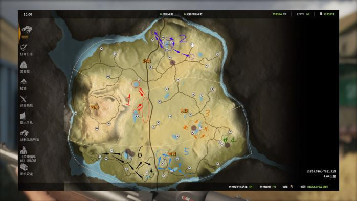 还有:楼主地图中的帐篷位置仅供参考,不推荐照搬,实际帐篷位置还是要根据自己地图中猎物的大体分布做适当调整! Ok我们废话不多说,先上一张蓝角马的大体分布图(同种颜色代表同一群!)。理论上来讲,一张地图中至少存在6大群蓝角马,按照每群40只来计算,那就有240只蓝角马,每只蓝角马的平均价格也有1000块,因此以猎取蓝角马来刷钱也是一个不错的选择。