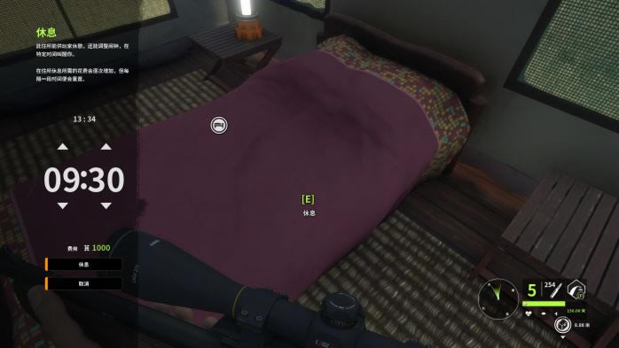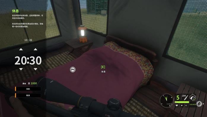 饮水区: 首先介绍蓝角马的饮水点,也就是“打饮水”。这个方法也是楼主一直以来非常推荐的狩猎策略,毕竟饮水点的 稳定性 远远 高于 休息区和进食区!! 对于时间的调整,在任意前哨站或搭建好的帐篷里对准 床铺 按 E 即可。 蓝角马的饮水时间是20:30-0:00,因此请带好夜视装备!调好时间后,原地等15分钟左右(游戏内时间)再“飞”,具体原因不做过多解释。