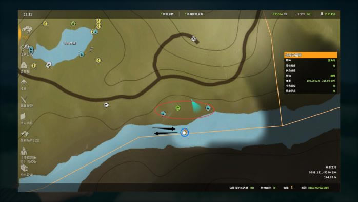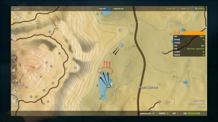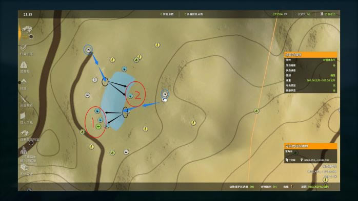 (搬运者 注:肚脐湖饮水点也可能刷在图四帐篷周围,建议先将帐篷放置于肚脐湖南端高低观测确认后,再根据自己图里的分布决定帐篷位。) 2. 第2个点:巨人之湖; 推荐指数:3星; 注意:这里的饮水点不稳定!!也就是说,来了不一定能遇到成群的蓝角马!! 打法:先从蓝圈帐篷复活,观察2号红圈位置,这里可能会有1-2只蓝角马在喝水,直接猎取并不会影响1号点的蓝角马。完了之后,可以跑到湖边,对1号点位进行观察和猎取。 除此之外,2号点也有可能聚集成群的蓝角马,但是,此情况只有在1号点没有成群的蓝角马饮水的时候发生!!因此可以从蓝圈前哨站复活,然后跑到湖边进行观察和猎取。如果你不怕死或者纯粹想刷钱,那可以直接从帐篷处复活,然后开打。 当然,如果1,2号点都没有蓝角马或是只有几只,同样的方法,原地等15-20分钟(游戏内时间),听轰鸣声,或者直接飞下一个点,打完之后再飞回来。