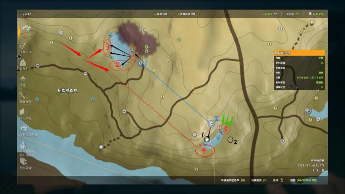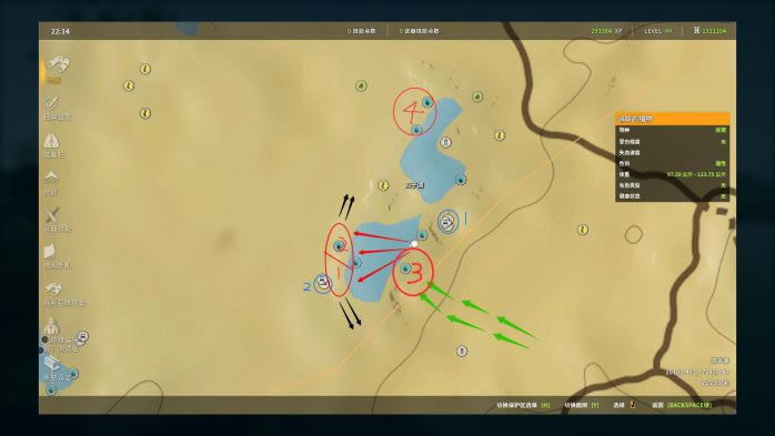 第3个点:双子湖; 推荐指数:4星; 注意:角马群会有小概率聚集在4号红圈位置饮水,这里距离比较远,射击时需要一定的枪法。当然,如果你有足够的耐心,也可以摸近再打。同样,这4个点最终只有1个点会聚集蓝角马! 打法:蓝圈帐篷处复活,跑到图片中的位置,对1,2号点进行观察,如果蓝角马聚集在1侧,可以在观察完之后飞到2号蓝圈帐篷位对其进行近距离打击,它们会沿下方黑色箭头逃跑。但如果聚集在2侧,则不建议飞过去,因为它们会向上逃跑(黑色箭头),而这个方向会进入一片树林,因此会非常难打,所以还是在湖对岸打比较好。 除此之外,如果1,2号点没有蓝角马,这时你就应该考虑3号红圈点了,毕竟这个点离帐篷比较近,有可能被覆盖,因此你就需要飞到2号帐篷位,然后对3号点的角马进行观察和猎取,其中绿色箭头为可能的迁徙路线。
