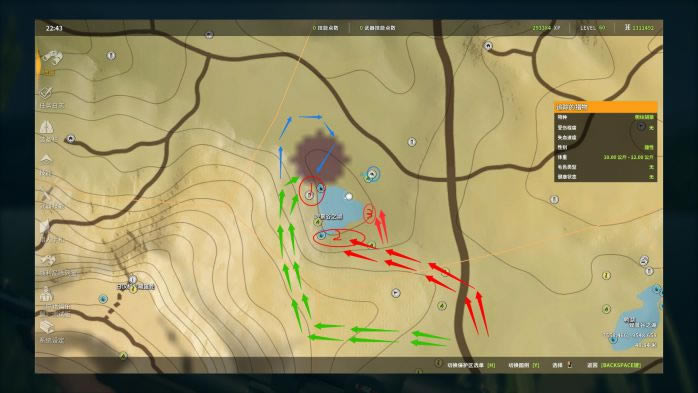 1. 第1个点:肚脐湖+观景谷之湖; 推荐指数:3星; 注意:4个点(1,2,3,4号红圈)当中 只会有 1 个点 会聚集大量蓝角马!! 打法:对于这个点,楼主建议两个湖轮着看,图1为大体结构图,图2和图3 为具体分析图。这里楼主推荐先从1号蓝圈帐篷复活,跑到图2中所在的位置对1,2号点(红圈)进行观察,如果没有蓝角马或是只有零散的几只,不妨跑到1号红圈处,对3号点进行观察。 其中红绿蓝三色的箭头表示蓝角马可能的迁徙路线,有的时候蓝角马迁徙到水边并不会立刻停下饮水,它们而是会在周围兜圈子(蓝色箭头),这个时候不建议立刻开枪,因为在饮水点被标记出来之前,如果它们被吓跑了,那么你将很难再次等到它们。 如果在1,2,3号点没有任何发现或者说只发现了零星几只蓝角马,这时你就需要“飞”到2号蓝圈帐篷处(图3),这里建议提前在黑圈处搭好三脚架,然后观察4号点的蓝角马。由于4号点周围可能会有狮子在休息,因此这里的蓝角马大概率会在你飞过来的时候逃跑(图3红色箭头),如果有条件的话,可以在2号蓝圈附近再摆一个帐篷,这样你就可以“半路打劫”了。 如果两个湖看下来都没有,可以在原地等15-20分钟(游戏内时间),边等边听是否有角马迁徙发出的轰鸣声,如果有轰鸣声,在原地仔细观察就行了,不需要去追,因为它们大概率会选择这两个湖中的一个来饮水;除此之外,也可以先飞到下一个点,打完了之后再飞回来。