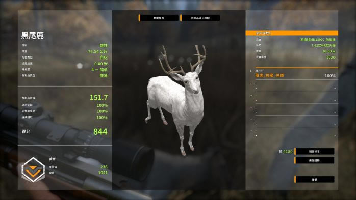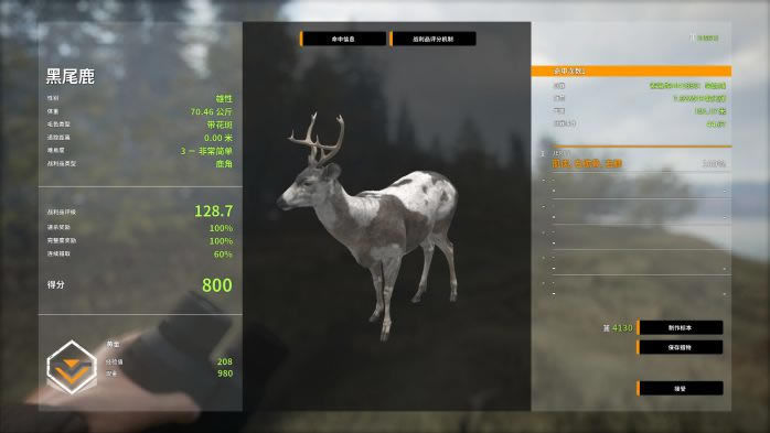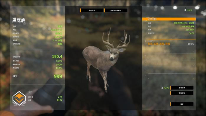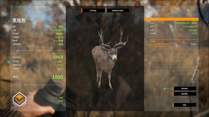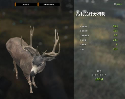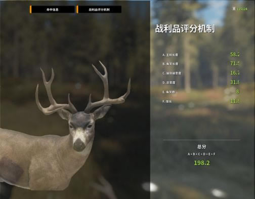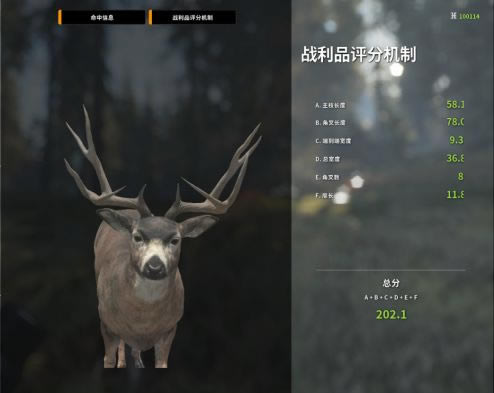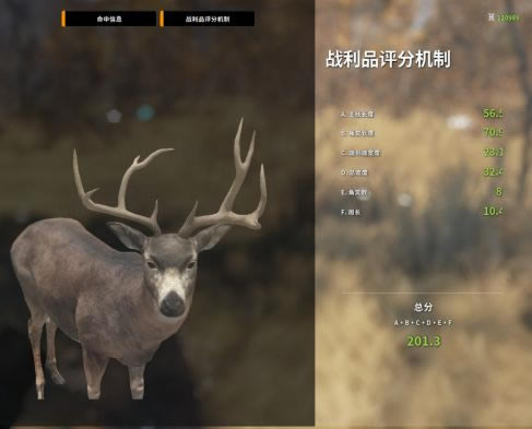 众所周知,黑尾鹿的角越歪,分数就越高,所以遇到4级以上且拥有奇形怪状的角的黑尾鹿千万不要放过哦 PS:现版本的战利品评分是下图的评分+10!现版本出钻标准209.8。