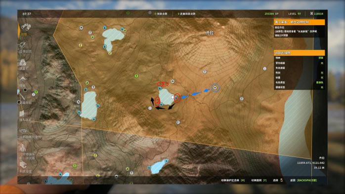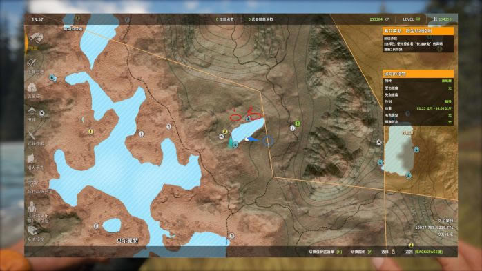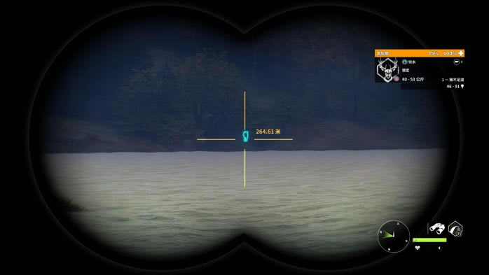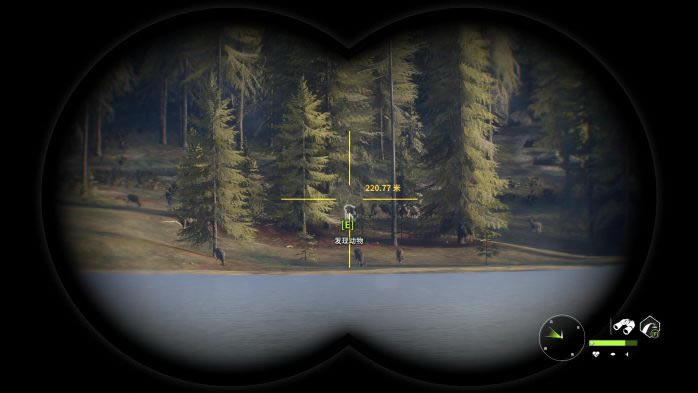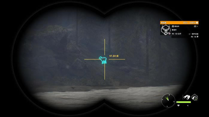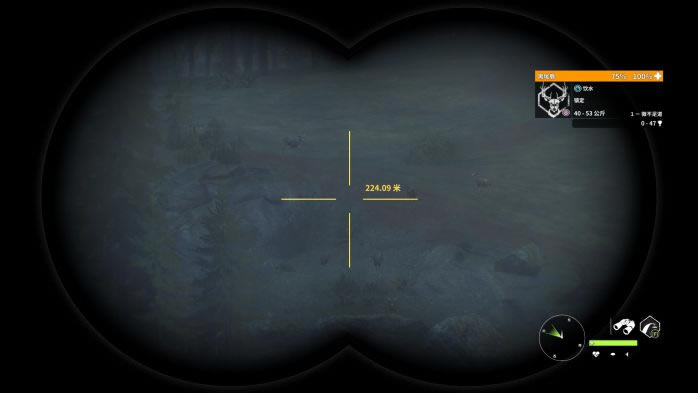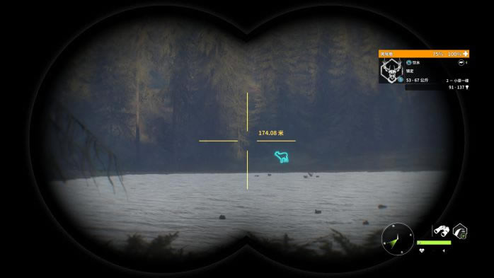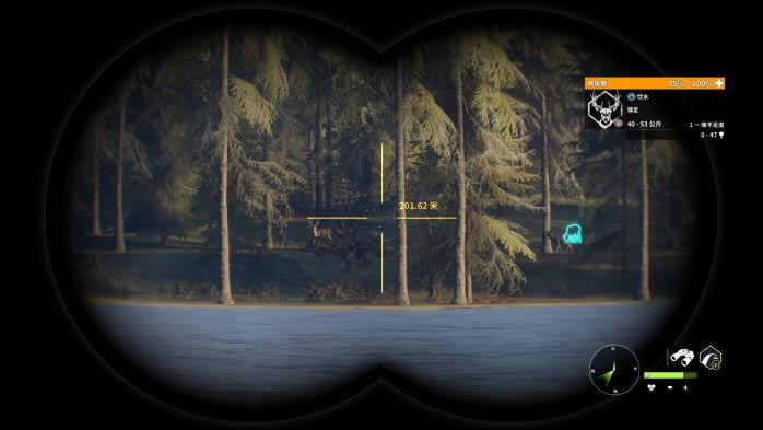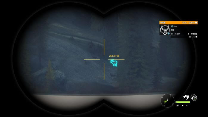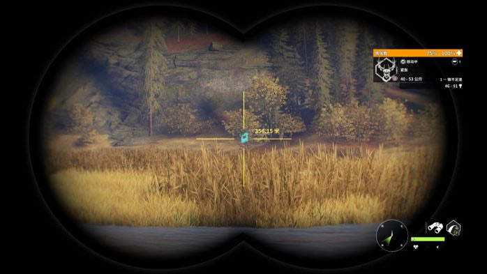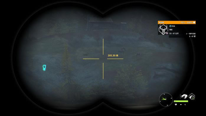 13. 第13个点,蓝圈帐篷复活,观察并猎取红圈处的黑尾鹿。这里的黑尾鹿有一定概率刷在树丛后面,因此直接看是看不到的,推荐走到图中的位置,利用仿声哨将它们勾引出来。 打法:M1突突突。