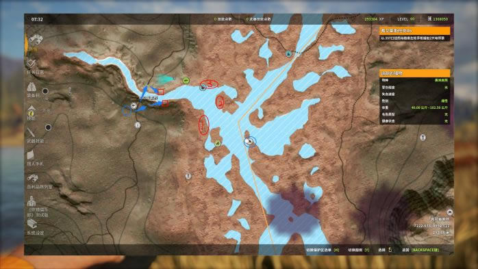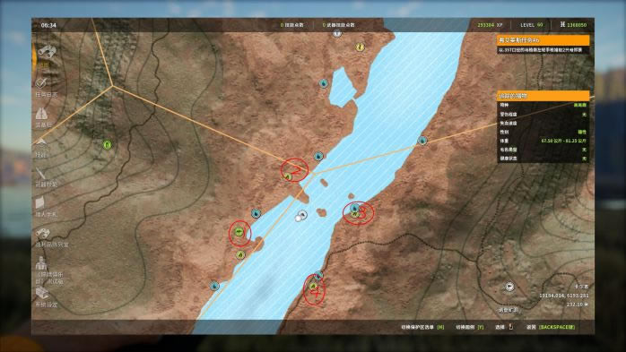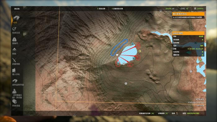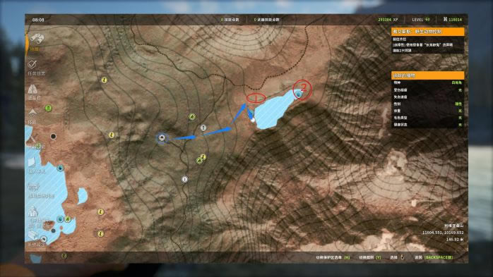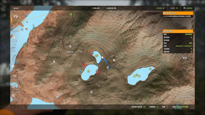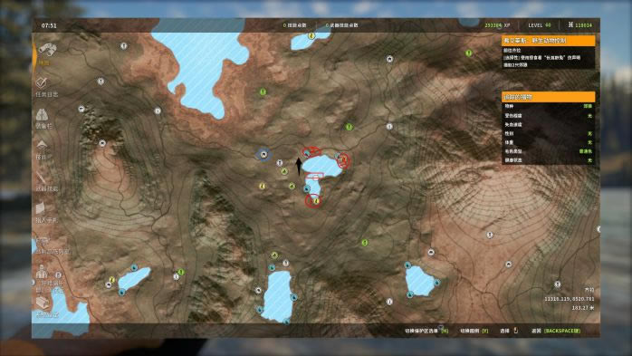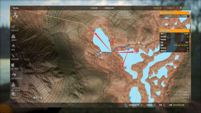 1. 第1个点,这个点是猎取的“黄金点位”,非常稳定!这里存在两个饮水点(1,2号红圈),其中1号点视野遮挡较大,需要走到我图片中的位置才能看清。 对于帐篷的摆放,可以摆放在图中蓝圈处。我图片中的帐篷位置不太好,复活后不能第一时间看到1号点。 打法:找一个好的射击位(通常以镜框中可以容下3只以上猎物为准),用M1对雄性黑尾鹿进行连续打击。打完之后,可以原地等它们回来,但楼主更推荐直接飞下一个点,等所有点打完一轮之后再调时间,飞回来继续打。