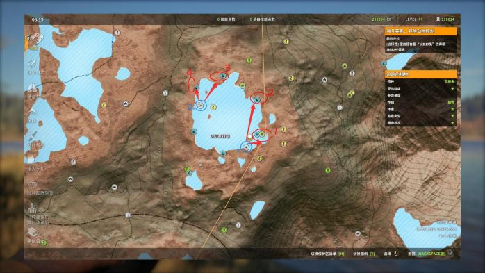 12. 第12个点,“黄金点位”。如果有条件,可以在蓝圈处摆个帐篷。走到(不推荐shift跑)图片中的位置,先观察1号位,看完先别急着打,再沿蓝线走到另一个池塘,观察2,3两个点,其中2号点不稳定! 打法:这个点没办法,牵一发而动全身,如果想一次打完,建议上弓箭。否则打完一个点只能原地干等或下一轮继续。
