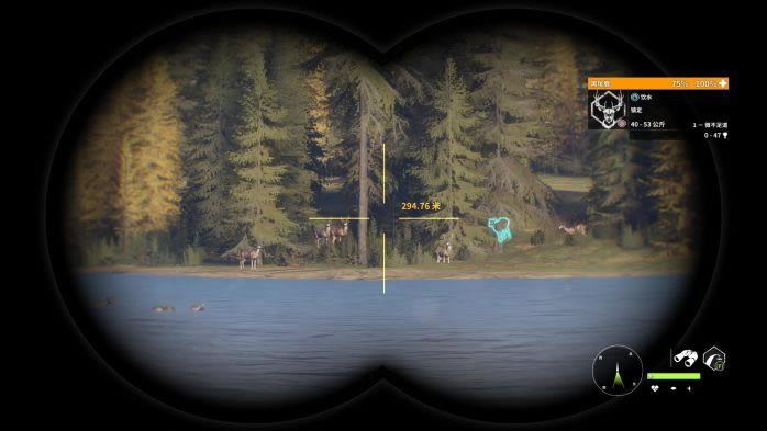 7. 第7个点,同样,蓝圈前哨站复活,到图片中的位置进行观察和射击,由于1号位视野遮挡明显,因此需要根据实际情况调整角度。此外,图片中所处的位置也有概率会有少量(1-3只)黑尾鹿在那里饮水,因此过去时需要稍加注意。 打法:先对2号位的黑尾进行逐一击破,再调整位置对1号位进行打击。由于这口湖跨度很广,射击距离较远,打的时候建议先打间隔远的黑尾鹿,因为这样打对群体的影响较小,如果打聚集在一起的,这必然会产生“打一只跑一群”的效益,无论距离有多远!
