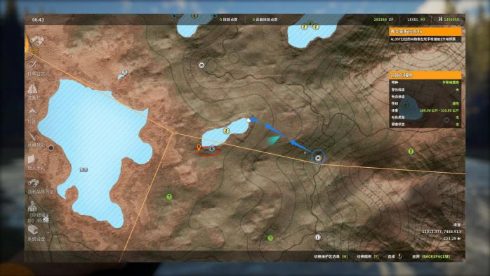 5. 第5个点,蓝圈前哨站复活,推荐按蓝色路线走,由于1号点地势较高,因此楼主建议先去观察1号点的情况,再往下走到图中的位置,观察并猎取2号点的黑尾鹿。 打法:由于在观察1号位时并不能直接看到2号位的情况,所以如果背包装得下,可以先用弓箭/弩+仿声哨先对1号点的黑尾鹿进行猎取,完了之后再到图中位置利用M1对2号位的黑尾鹿进行猛攻。