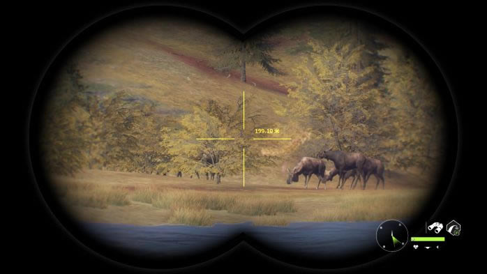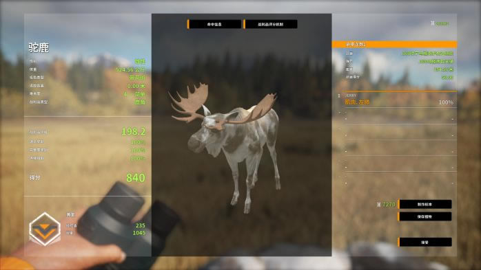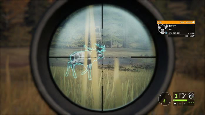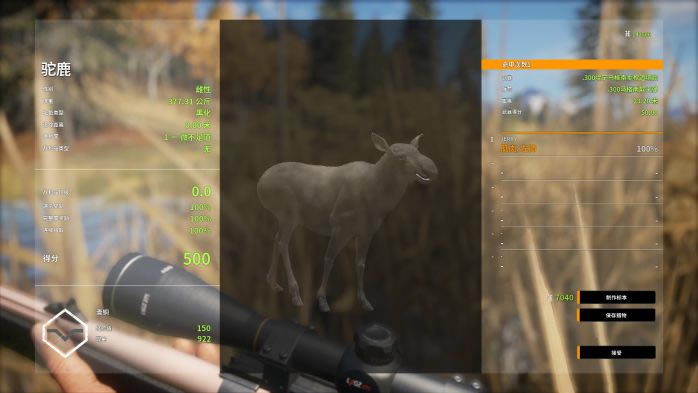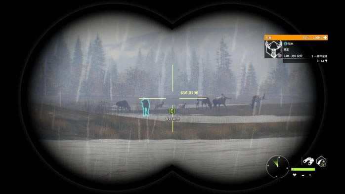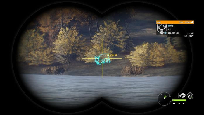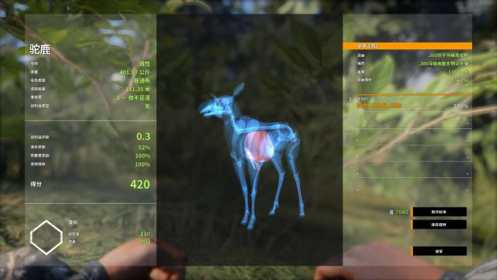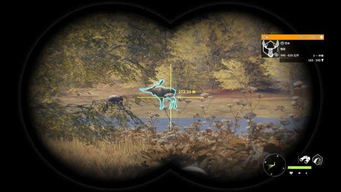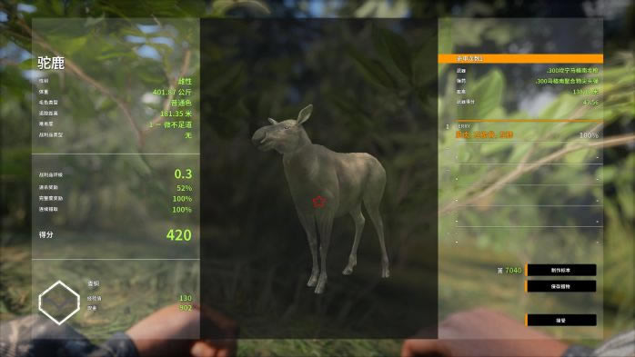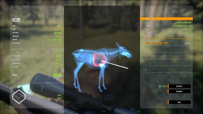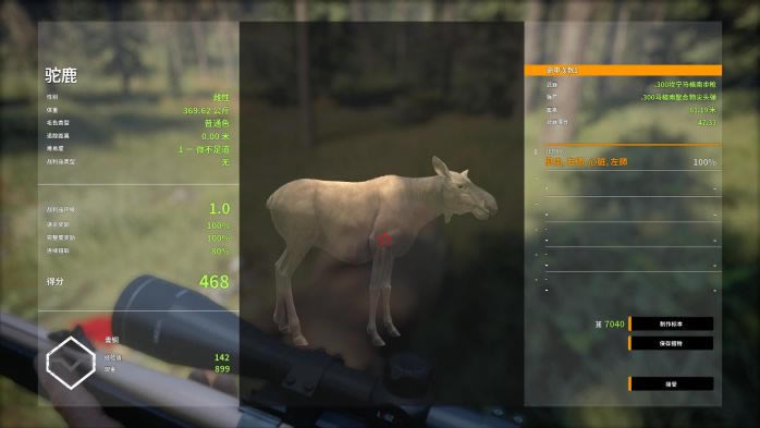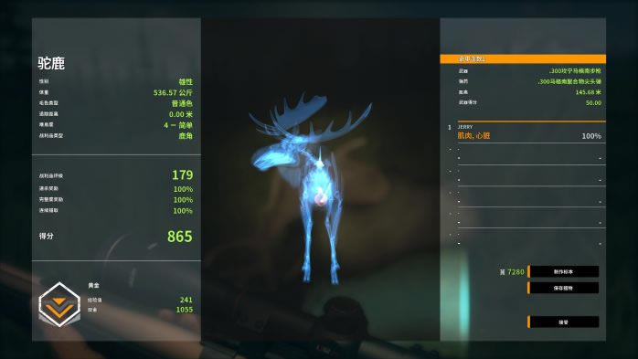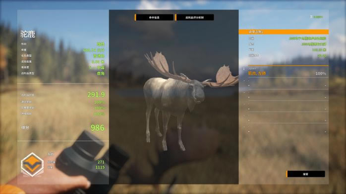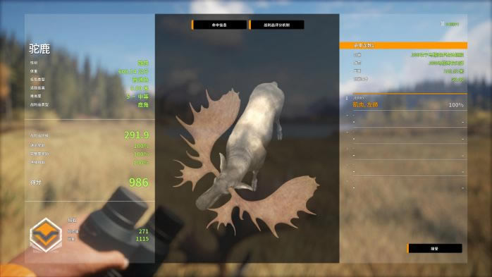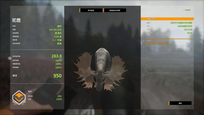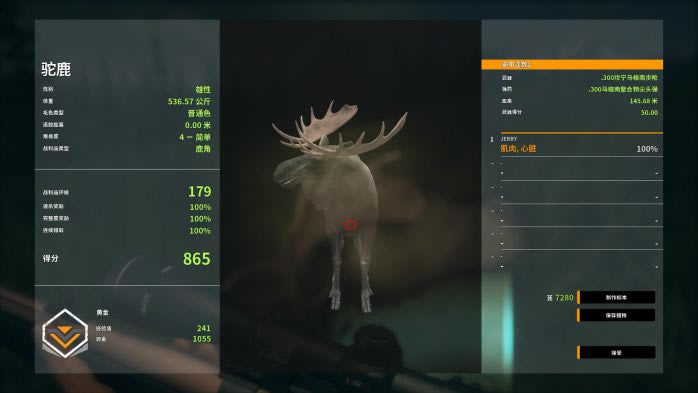 在介绍点位之前,我这里要说两句。由于版本更新,速杀已不影响评级(但会影响游戏得分,经验和钱,但这些都无关紧要了),现在影响评级的只有:1.枪械弹药类型;2.是否在两枪之内击杀;3.战利品器官完整;4.两枪内是否有一枪是“致命伤”。 在枪械弹药选择方面,现在必须根据猎物的等级选择适合该等级的枪械,否则将会面临“降级”(钻石变成黄金,黄金变成白银),详情请参考枪械猎物对照表,这里不做过多赘述。 在两枪之内击杀,顾名思义,不多解释。 战利品器官完整,这个很重要,对于驼鹿而言,爆头击杀已成为过去(除非你不在乎评级),而且任何战利品器官是“颅骨”的猎物,如果是被爆头击杀,都会被降级。 两枪内至少要有一枪是“致命伤”,这个想必是这个版本的一大福利,这并不需要太好的枪法,拿上7mm以上的枪朝肺部开一枪就完事儿了,顶多追一会儿,而且驼鹿的肺很大,如果侧面还打不到肺,那就卸游戏吧。 当然也别高兴的太早,这个版本的驼鹿,钻石评级要求偏高,老版本大概280能出钻,现版本要290.7,而290.7以上的角基本都是5叉、6叉的巨角,而且这个版本的评级一切都以战利品分数为准,这就导致了很多满级甚至满体重的驼鹿出不了钻。