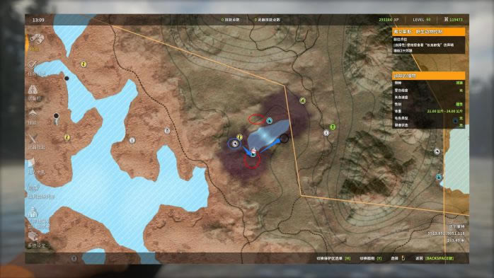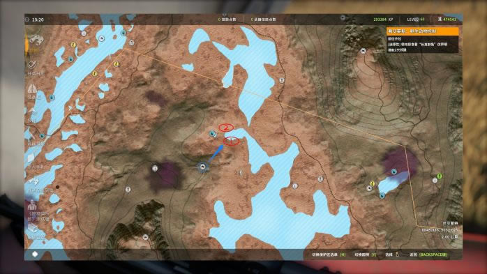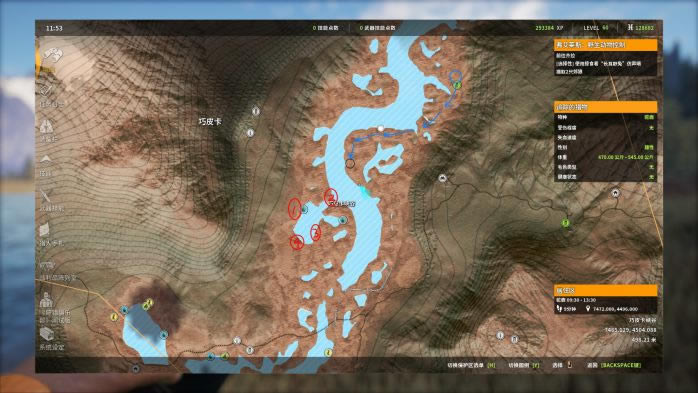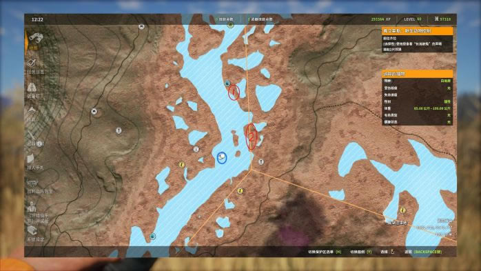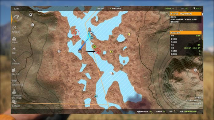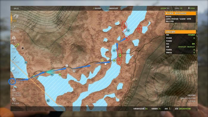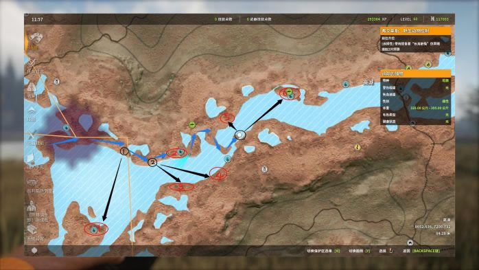 第七个点,这个点视野遮挡较大,比较耗时。蓝圈帐篷复活,同样的问题,下方红圈不会第一时间刷出驼鹿,建议按照蓝色路线走到(最好不要shift跑!)我图片中的位置,观察上方红圈的驼鹿,这里树木比较多,视野遮挡较大,需要自行调整观察和射击角度。完了之后,走到黑圈位置就能看到下方红圈的驼鹿了,这里树木也很多,请自行调整角度,不一定要在黑圈位置,在水塘对面也可以。