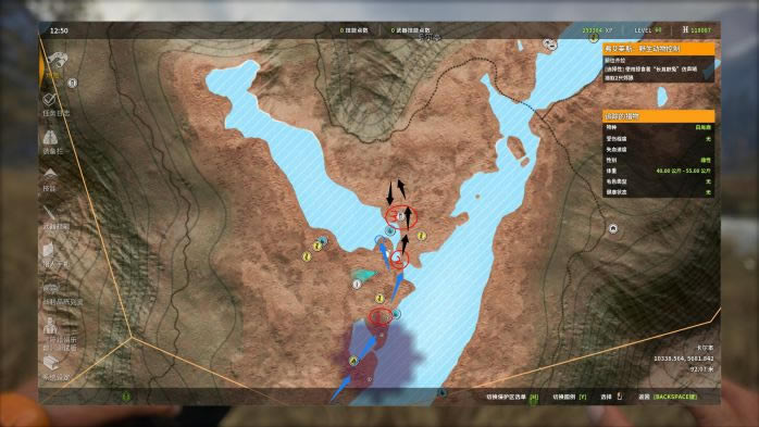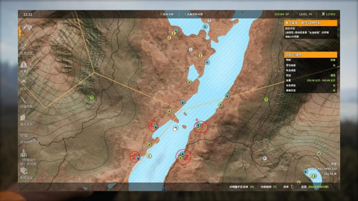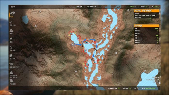 第九个点,在打完第八个点后,继续向上游走,注意观察1号位(不稳定,0-3只)。由于2号点地形呈下坡地势,并且被树丛环绕,这里楼主建议直接shift跑过去,把它们吓出去,而且它们一般会按照黑色路线逃跑,这时你只需去蓝圈位置等就行了,但在等的时候尽量保持隐蔽,无声,不建议吹哨子! 此外,3号位也是一个固定饮水位,通常有3只驼鹿。