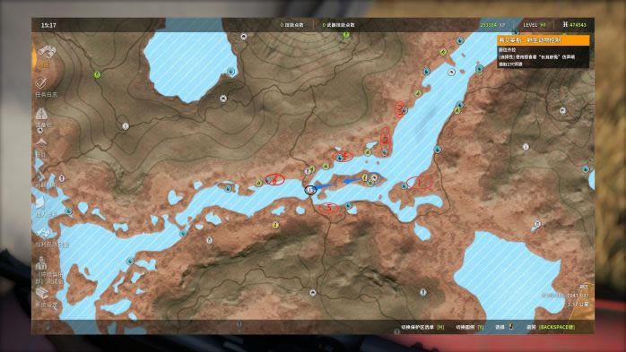 第十四个点,蓝圈帐篷复活,先观察射击1,2两个可能的饮水点(不稳定,每个点0-3只),如果没有发现,就走到黑圈位置,观察3号位的驼鹿(不稳定,0-3只)。完了之后,再走到狩猎台处,也就是2号黑圈,观察猎取4,5两个点的驼鹿(稳定,每个点1-3只)。