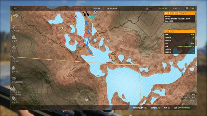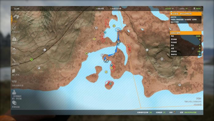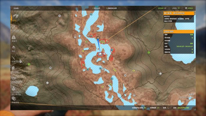 第十个点,蓝圈帐篷复活,复活的一瞬间可能会吓跑1号位喝水的驼鹿,但不必担心,它们肯定会沿黑色路线逃跑,你只要别被它们顶死就行了。然后根据蓝色路线来到水塘边,看2,3,4三个点的驼鹿,视野很好,射击没难度。如果你想等1号位的驼鹿回来,可以去2号红圈位置等。 打完后,根据蓝色路线分别观察并猎取5,6两个位置的驼鹿,其中5号位地形呈斜坡趋势,可能会有1-2只驼鹿看不见,这里我提供两个办法,第一个就是从旁边绕过去,这个比较耗时;第二个就是摸到150米,拿出.22LR步枪朝它们脚下开一枪,注意是一枪,然后它们就警觉了,但不至于逃走,这时拿出驼鹿哨子吹几下,它们大概率会朝你走来。此外这个方法对于某些身位不太好的动物可以起到让它们变换身位的作用。