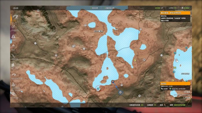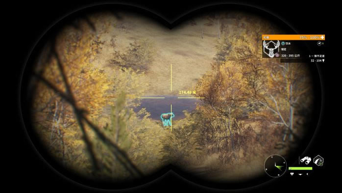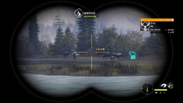 第十五个点,从蓝圈前哨站复活,跑到黑圈处,架起三脚架,观察猎取红圈位置的驼鹿,这里通常会有1-3只驼鹿。