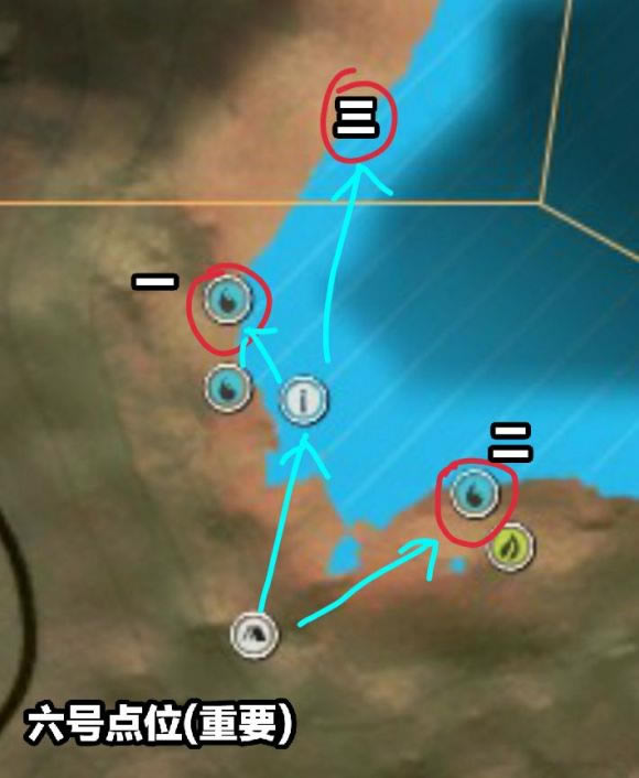 (这个图里用来观察1号点的那个建筑物不是三脚架,而是一个狩猎帐篷。这个地方个人没发现太适合架设三脚架和书架的点。如果有吧友发现了,请注意帮忙补充。 ) 6. 六号点位 兽群稳定性:高 发现难度:极大 推荐程度:比较推荐 这个位置是楼主又爱又恨的两个点之一,之所以爱,是因为这里的牛很稳定。但恨是因为……树太多,草太密,发现难度不是一般的大…… 理想状态下从帐篷出发,走到湖边观察1号点位,猎杀之后观察3号点。再回帐篷,从山坡向下观察二号点位。(这三个点的牛群经常被大量的树丛遮挡,比起隔湖,绝大多数时候需要摸近观察)