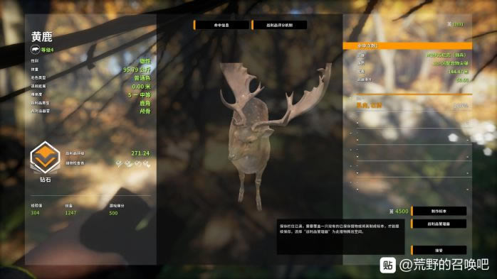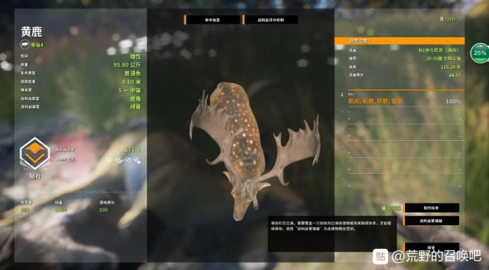 黇鹿为4级动物,完整度为3006,血量少用硬弹即可,可以轻松速杀,易被哨子吸引,饮水时间(9:30~13:00),部分会在9点开始向饮水点前进,但由于经常晚点的原因,建议调好时间后等待到9:50再前往饮水点。需要特别注意的是,同个饮水点若存在多个鹿群,往往会出现先后到达的现象。 黇鹿最高等级为5级,存在伪钻,钻石鹿角极其嚣张,非常容易发现。