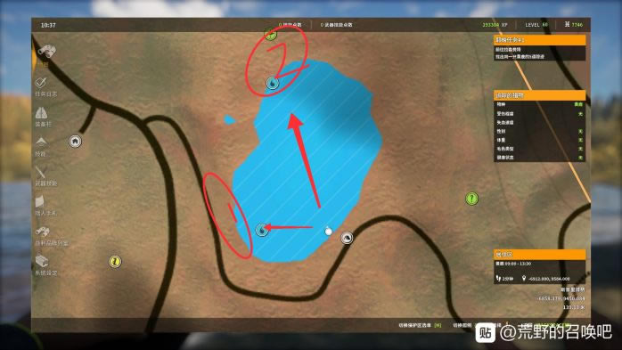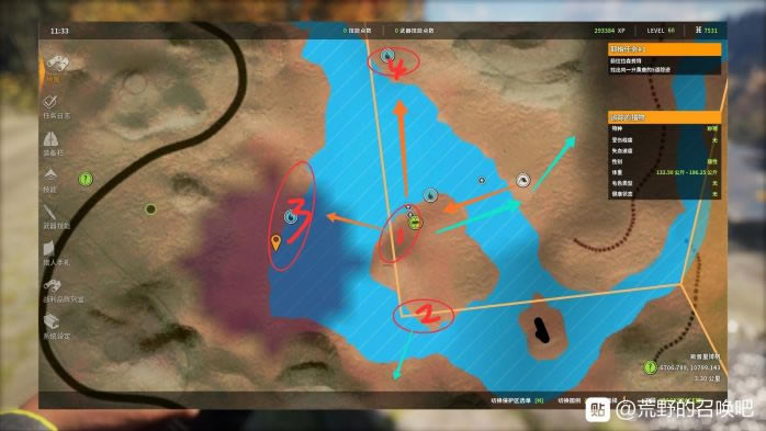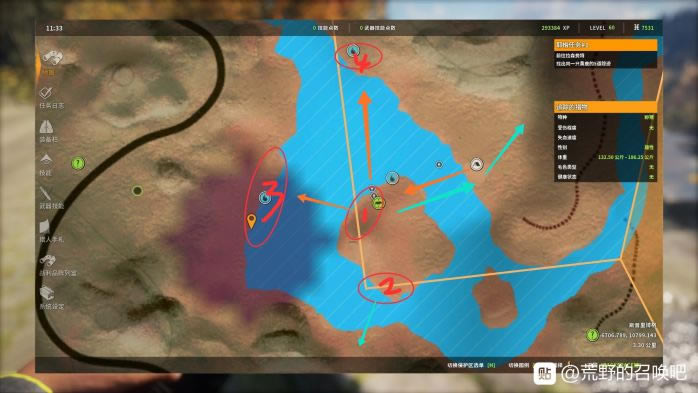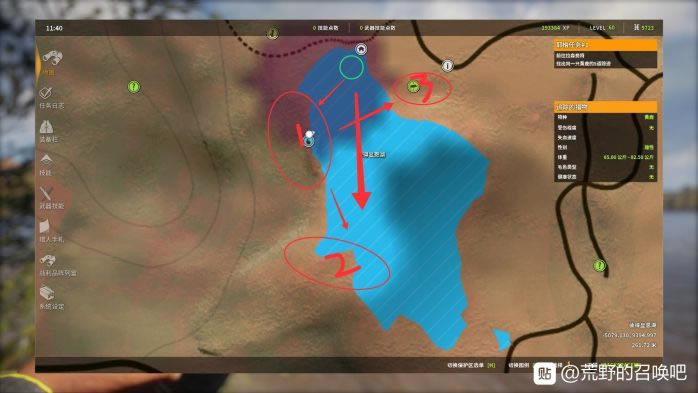10. 【饮水处10】此点地形复杂,在多次摸索后发现附近大概率会有黇鹿饮水点,由于该饮水点范围较大,存在3个可能饮水点。 饮水点3在第二张图中标出,由于视野极差,较难猎取,因此忽略此点。 在图中所示处帐篷出发,走到桥上,若黇鹿在1号处饮水,则在150米开外,视野好,较易猎取。若在2号处饮水,则存在两种情况,第一种情况是在桥的斜下方(大约90米处),此时高等级黇鹿会逃走,重进游戏由帐篷处摸去猎取即可。第二种情况为距离桥300米处的地方,在桥上大概率无法看到鹿群,沿河前进即可看到。 值得注意的是,紫圈处固定为欧洲野牛休息区,若没有发现黇鹿,可适当猎取,楼主在此点出过1钻2白化