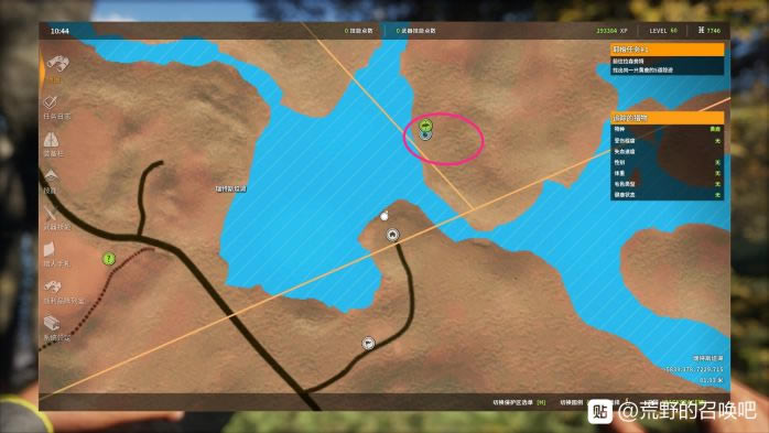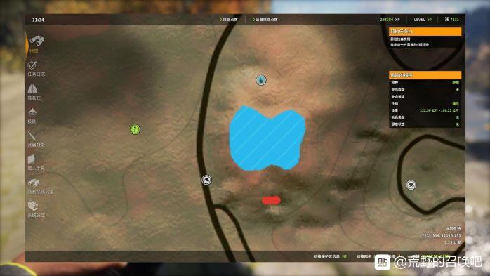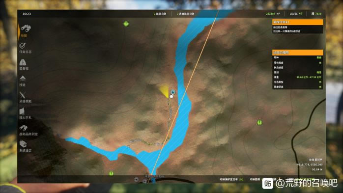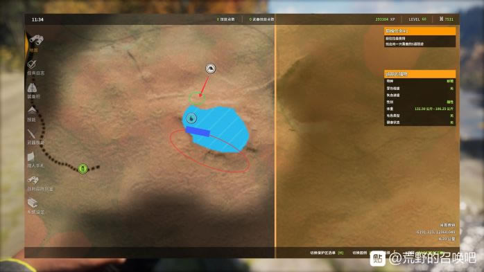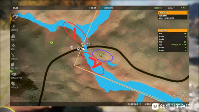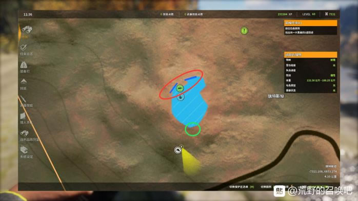 9. 【饮水处9】这个位点极大概率存在单只雄鹿,但由于较为固定且猎取难度不高,有跑一趟的价值。从帐篷处出发,注意不能shift跑,走到绿圈处后,会发现视野被遮挡(图中蓝线),用哨子吸引即可。