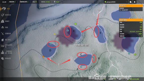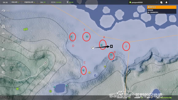 先传送到帐篷箭头方向走到湖边观察A、B两点,之后走到A点观察C点,注意离岸100米左右不要跑不然会惊动A、C两点驼鹿,之后走到A点观察C点;之后回到帐篷箭头方向到岸边观察D点;传送到前哨站箭头方向走到E点,一般会惊动E点驼鹿,看情况狩猎,之后箭头方向走观察F点。其中A、B、D、F为稳定点一般刷1-3头驼鹿,C、E为不稳定点,A点容易被遮挡。