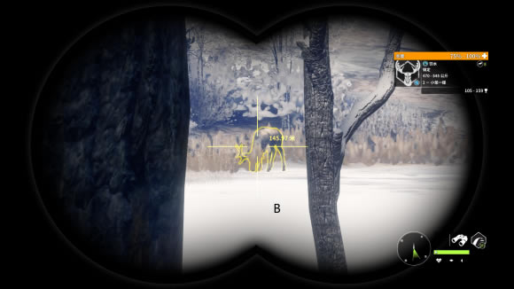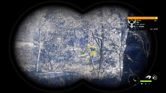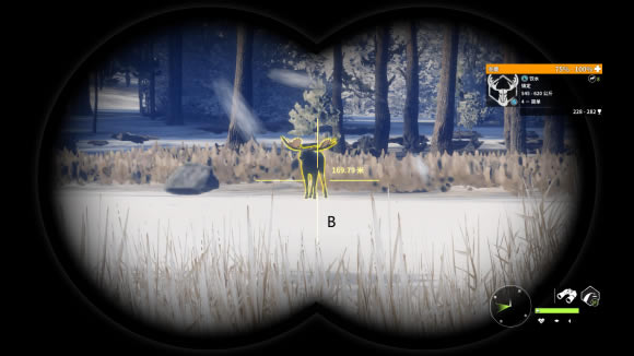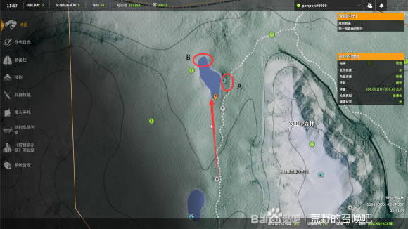 传送到前哨站箭头方向跑,跑到岸边100米左右用走,观察A点,这个点位的驼鹿一般在山坡上而且容易遮挡,注意观察,之后到湖面上观察B点。这个点位容易被草遮挡,抬头可以看到角,这两个点都很稳定刷1-3头驼鹿。