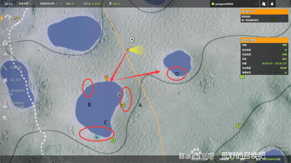 传送到帐篷箭头方向走到岸边,在离岸150左右步行并观察A点,到达岸边观察B、C两点,A、B点为稳定点,一般刷1-2头驼鹿,C点为几乎必刷点,刷1-3头驼鹿相隔较远喝水,而且容易被草遮挡,抬头时可以看到角,之后走到D点,也可以回帐篷走到D点,这个点位的驼鹿不稳定并且容易被惊动,即将走到时注意观察。