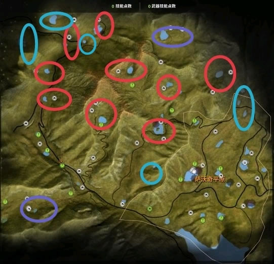 2狩猎时间 该物种有两个时间段用于饮水分别是7:00~8:00和 17:00~18:30 7:00~8:00有部分饮水点会延长至8:30 个人更推荐7:00~8:00,优点为: 1.便于观察毛色 2.无需利用夜视镜观察和狩猎 3.同一时间会有大角羊饮水和美洲黑熊进食,马鹿进食可以辅助观察是否存在美洲狮 3.具体点位 红圈为前哨站附近点位 紫圈为前哨站改良点位 天蓝圈为帐篷点位 点位会以红色点→紫色点→天蓝色点为顺序,该顺序不代表点位排名