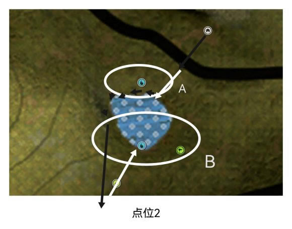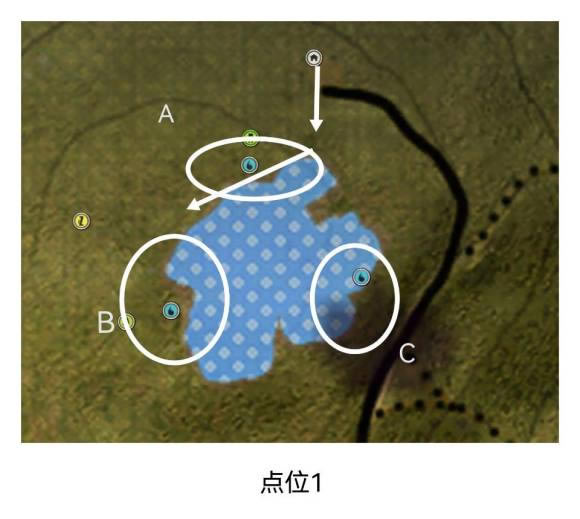 帐篷有二个摆法,第一种可以选择压住A点,先观察c点,之后跑出200m,到达树林处,观察A点,传送回帐篷,边跑边观察B点 第二种是点不压位A点,先观察C点,再快蹲移动并观察A点,再看B点 也可以直接看毛色踪迹和脚印,不看A点