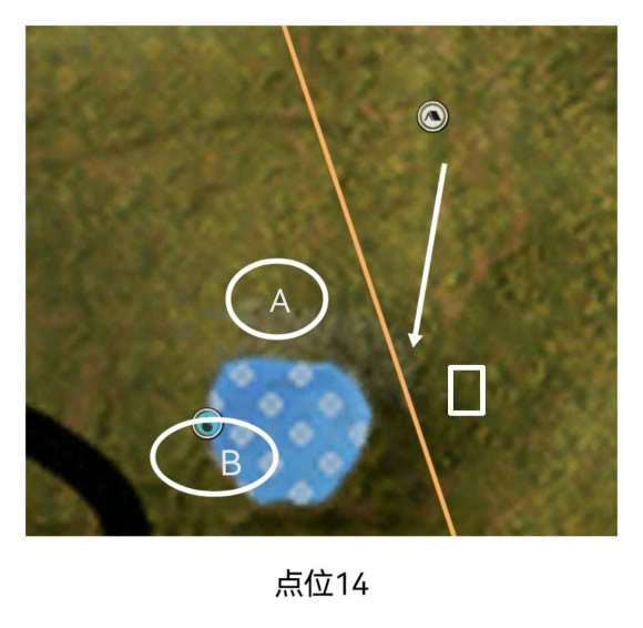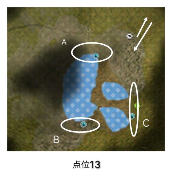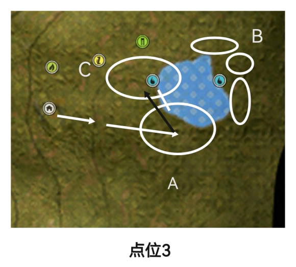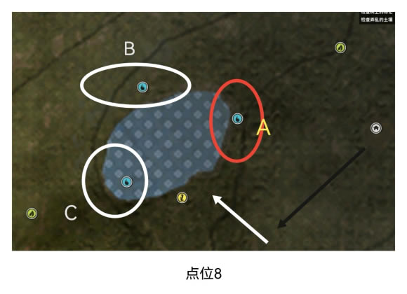 从前哨站出来后首先观察A点,需要认真观察,可能会刷在树后 之后再观察B点,如果没察到,可以退后至300m,会消草方便观察。 最后按箭头移动至大概位置,观察C点