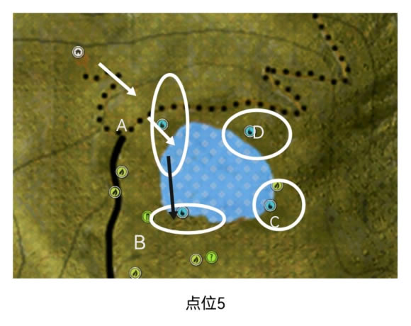 C,D可能是同一个饮水点的不同位置,若其中一个位置存在,另一个位置存在概率会很小 首先观察D点,之后步行至可以观察A点,狩猎完毕后,再跑步到A点,观察B点,再跑到B点(途中可以观察到E点)观察C点,若观察不到,移动到离C点300m处除草观察