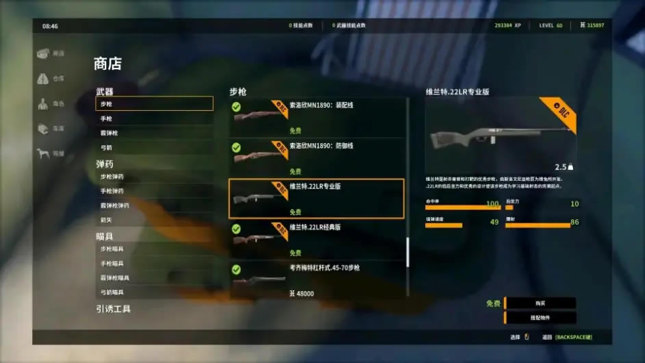 《猎人:荒野的召唤》是Expansive Worlds开发的一款第一人称射击冒险游戏,于2017年2月16日发行。2022年6月,Expansive Worlds宣布,开放世界狩猎模拟游戏《猎人:野性的呼唤》的最新DLC“雷文图里海岸(Revontuli Coast)”正式发布。 猎人荒野的召唤步枪是游戏中的主要武器之一,本作有哪些常用的步枪武器?下面给大家分享一个猎人荒野的召唤全步枪使用指南 一,关于游戏中弹药的选择。 目前游戏中每一种枪械通常配有两种弹药(少数例外),大致的可以分为软弹(扩张型弹药,有软尖弹、空尖弹等)和硬弹(穿透型弹药,步枪多为聚合物尖头弹)。 两种弹药并无高下之分,而是有具体的适用场合。 一般来说,猎物速杀可以采用软弹侧面打肺、硬弹正面打心脏、颈椎的方式。 其中,软弹打肺大多数时候需要根据猎物目标级别来选择,例如大多数范围4-8级的弹药,软弹都难以做到单肺速杀8级猎物,此时则可以选择用硬弹打心脏的方式来完成速杀,当然,类似这种情况更多建议改用7-9级枪械。 也有一些性能优秀的枪械例如.300软尖弹又可以稳定做到单肺速杀9级动物,这些都是需要经验的积累。 一般情况软弹单肺的伤害要大于硬弹双肺。硬弹双肺是一种新人常用的、但效率比较低的速杀方式。放在以前我是不建议用硬弹打肺的,但是在当前版本下,狩猎已经取消了速杀度的要求,这使得软尖弹的使用率大大降低,而硬弹几乎成了猎人的首选,或者唯一选。 如果是作为一名喜欢追求完美速杀的猎人来说,软尖弹依然可以作为这类猎人的选择。 其余情况,目前均推荐优先使用硬弹。 不过需要注意,一些枪械也有某种弹药性能特别强或者特别弱的情况,那么在使用这种枪械的时候也要避开弱的弹药而选择强势弹药。 下面是一些具体的枪械性能的评估和经验,不一定完全准确,供参考。 弹药等级1级: 维兰特.22LR步枪,获得渠道:武器包1,Weapon Pack 1,这个级别的步枪目前只有维兰特.22这一把,如果你想狩猎游戏里弹药级别为1级的动物(鸭子、大雁、兔子等),步枪里只有这一款选择,暂时属于无可替代品,而且相较于弓弩与霰弹枪,它依然是狩猎这个级别的首选武器。 除了拥有射速快,后座力小的优势外,它还有一个得天独厚的优势:噪声小。 游戏里武器产生的噪声分为两种,一种是射击时的枪声,一种是子弹(箭矢)落地或者击中目标时的子弹声。这两种噪声都会对猎物造成一定程度的惊扰并且是可以叠加的。 .22的优势在于多数步枪的枪声惊扰距离都为200米,而它只有150米。多数步枪子弹落地时的噪音可以直接令附近未被击中的动物从镇定状态变为逃走状态,而它的子弹落地声只会令目标警戒状态上升1-2级(动物警戒度大致分为镇定、聚精会神、警戒中、惊恐、逃走)而不会直接逃走,并且动物未逃走前的警戒状态是可以随时间恢复的。 利用这个特点,在射击1级动物上,在150米以外的距离射击目标,每间隔10秒射击第二枪(等待警戒度恢复为镇定状态),可以达到无惊吓猎取群体的效果。 而在猎取其它物种上,猎人经常会遇见射击位置不佳的情况,例如动物臀部朝向猎人时,我们应该如何应对? 一是猎人可以自行移动靠近目标寻找射击角度,二则可以让猎物主动移动,给我们创造机会。对于150米以外的目标,这时候则可以选择使用.22步枪射击目标身旁的地面(前提是你并不在乎个人的命中率数据),以此产生的子弹声会对目标造成一个干扰,使得动物进入警戒状态而改变当前行为,再更换适用目标弹药等级的武器进行猎取。