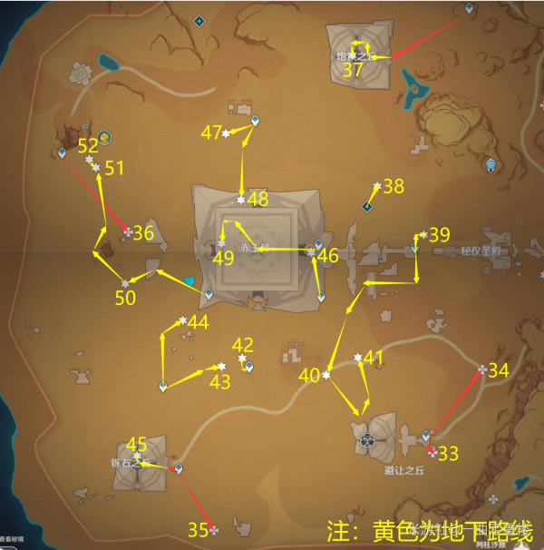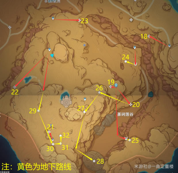 2、六角星标记为地下(非地表)的仙灵 3、地表能明显看到的仙灵就不详细说明了 4、红色路线为地表路线 【下风蚀地】1~17号仙灵点位图