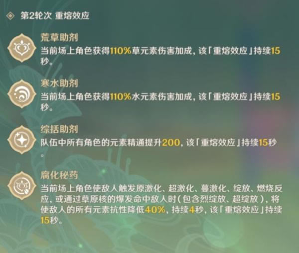 在队伍的操作手法上,建议先由行秋与柯莱的元素爆发与元素战技起手,在后台挂起水元素和草元素持续附着,再使用「重熔效应」,根据所获得增益,选择草伤提纳里或水伤心海输出。提纳里依旧是战技加三下重击。