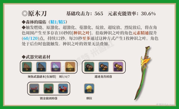 4星武器中,基础攻击力仅次于暗巷闪光(610),突破增加元素充能效率。掉落“种识之叶”全队都可以拾取,谁拾取谁加精通,最多拾取1枚。 ①.旅行者(草) 草元素旅行者大招能量为80点需要堆叠充能效率加速循环,且草主的大招属于脱手技能,在草元素相关反应队伍时可以脱手触发草元素反应产生的“种识之叶”用来提升其他角色。 ②.枫原万叶(风) 万叶的技能染色后也能触发草元素相关反应,且大招为脱手触发,在搭配部分草元素队伍时(雷草激化、水草绽放等)如果万叶可以进入队伍,那么便可以使用这把武器,即可增加充能优化循环又可以为队伍其他角色提供精通。 ③.班尼特(火) 既有可观的武器白值,又有副词条的充能效率,从这两点出发便会让人联想到锻造一把给班尼特使用。 但班尼特使用时也需要考虑武器被动是否可以稳定触发,其中雷草激化队伍是不推荐进入的,因为火元素会使敌人的原激化状态提前结束,且激化反应本身作用于基础倍率区间,会与班尼特的加攻击力相稀释。 绽放队伍中的火元素更需要持续火元素角色,因此班尼特如果使用这把武器且还想触发被动,那么大概率会进入未来燃烧相关的队伍。 ④.久岐忍(雷) 久岐忍的主要技能手段并非大招,因此其对于充能效率的要求不高。但是,其元素战技的脱手效果在配合触发草元素相关反应时可以很轻松地触发武器被动效果。从而产生“种识之叶”提高队伍其他角色的元素精通。 2.森林王器
