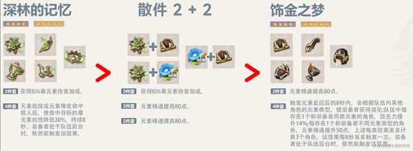 也优先选择2+2会更好,不单能更早的毕业,伤害收益跟深林套装相当。如2深林+2饰金、2深林+2乐团、2乐团+2饰金等等。老玩家也可以临时先用乐团4件套过渡。 PS:「深林的记忆」、「饰金之梦」圣遗物,需在祝圣秘境「缘觉塔」 中获取。 ◇祝圣秘境「缘觉塔」解锁条件: ?冒险等阶≥22 ?或完成魔神任务序章·第三幕「巨龙与自由之歌」 需要达到以上条件才能开启祝圣秘境「缘觉塔」。 队伍搭配