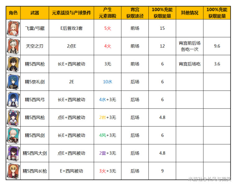 角色充能与队伍相关 1、不同元素角色开启战技输出时会产出数量不等的同元素微粒,物理普攻时也有概率获得固定1点能量。 2、角色前场获取同元素微粒=3点能量,后场获取x0.6则为1.8能量(100%充能) 3、角色前场获取无元素微粒=2点能量,后场获取x0.6则为1.2能量(同上) 4、角色前场获得异元素微粒=1点能量,后场获取x0.6则为0.6能量(同上) 5、怪物掉落的元素晶球按对应元素颗粒的基础能量乘以3。例如火元素晶球=3火元素微粒X 3=9点能量。后场获取同样x0.6,以此类推。 6、宵宫开E后普攻每2秒可产生1颗火元素微粒,打满3套普攻共计5颗,100%充能效率下宵宫前场回复15点能量。 7、宵宫队输出通常以队友先释放战技和爆发,上增益,补能量,而后宵宫上场爆发输出,意味着队友先产能。 了解完相关信息后,长风蜀黍来和大家确认第一个需求: 一、为什么要开大招?开大招我们会得到了什么,不开大招我们会损失什么。 1、对群伤害 2、补足后台伤害 3、避免飞雷被动减层 4、增益队友 从角色命座和固有天赋设计上来看,宵宫大招本质上是EA15后下场前释放的,结合E技能的CD和切队友补状态的时间,理论上是可以做到无缝循环的,由此可见,宵宫是一个可以做到全程前后台输出的角色,更是一个不能撇开后台输出单论前场伤害的角色。 单从伤害倍率上来说,9级大招开与不开就有1251%的差距,6级也差1033%,真爱党满命全皇冠的宵宫更是差了2083%,以满级0命宵宫,2200攻击力,暴伤150%来算,9级不开大招的纯暴击伤害落差就有3W7多,这已经算是很平民的面板了,面板越高,差距越大,这还不算命座和队友BUFF的加成,以及群伤和反应伤害。(如果你认为这些伤害是蚊子腿,看不上,那后面的就没必要往下看了。) 其次,按固有天赋炎昼风物诗的加成,不论大招先放后放,队友是否能锁面板,这10%-20%的攻击力加成都是一个几乎能覆盖副C输出时间的BUFF,因为是直接加在副C身上,且持续时间比宗室套更久。(非攻击向副C夜兰不计在内)在面对群怪时,1命宵宫队伍先手大招,额外增加大招4秒(2次伤害),且快速击杀标记的怪物更能让宵宫获得长达20秒的20%攻击力加成。 不要小看这些蚊子腿的伤害和加成哦,深渊里差十几二十万输出凹不过去的平民玩家大有人在,蚊子腿多了是可以成为鸡腿的呢。而相反不开大,因为自身产能、怪物产能和充能效率影响,飞雷宵宫往往在第3轮普攻时能量就已经满了,这意味着,我们的最后一轮普攻将损失飞雷第三层40%的普攻伤害加成BUFF,变成只有24%的加成,如果中途开大来获得飞雷满层BUFF,大招动画的时间又浪费了E技能的加成时间,无论哪个都是亏到家了。 所以需求一的结论就是,不论你的武器是飞雷还是弓藏或者其他弓,都应该开大,飞雷宵宫更应该先手开大。 随之而来的就是我们的第二个需求: 二、宵宫配队这么多,如何做才能既开大又不影响追忆套启动呢? 长风蜀黍以这一年多来各种宵宫队伍使用经验和参考了大多数玩家的配队,先为大家罗列一张宵宫队常用角色的产能和宵宫100%充能下获取能量的表
