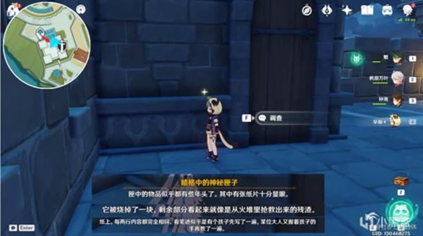 「致法尔伽团长」的信 法尔伽团长亲启: 我由衷地感谢您能关心并慰问这些事。父亲如能知道,一定也会为您的赞许感到光荣。没有什么比受到北风骑士的认可更值得他高兴了。 我正在旅途中,非常幸运,顺利收到了您的来信。不出意外的话,我应该不会回骑士团。但过去的经历我不会忘记。骑士团教会我的事,我也谨记在心。祝您身体健康。 「致代理团长」的信 琴亲启: 衷心感谢代理团长的关心。你说得不错,我或将不再对那件事耿耿于怀。 惩办渎职的伊洛克,其本质是纠正骑士团过去的错误。对骑士团本身意义重大。至于我的个人安全,暂时还无需骑士团操心。骑士团应当将人力用在刀刃上,照顾那些需要帮助的人。也祝你身体健康。 暗格中的神秘匣子 位置:西风骑士团房顶,传送点飞过来,第一个门前的墙上。
