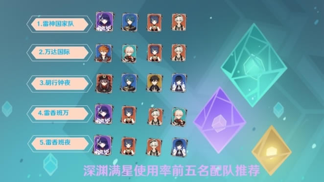 (1)细心小伙伴和发现香菱、班尼特出勤概率非常高。所以目前最强两人组合非香菱、班尼特莫属,是目前2.8深渊版本答案组合。 (2)胡行钟夜是五个热门配队中唯一没有香班组合的队伍。胡桃虽然说对群能力不强,但是高爆发蒸发普攻、重击伤害可以一定弥补自己短板,队伍带钟离也是简单无脑。并且胡桃也有爆发的对群元素爆发手段。其实是很简单道理,高伤害面前一切都是浮云(除了破元素盾)。 (3)这游戏队伍一定要主C吗,很多萌新没有主C都在犹豫抽强力辅助还是一个主C。但是雷电将军的队伍可以不一定需要主C,雷电将军本身拥有战场能力,而且可以解决队伍比较重要充能循环问题,是多功能增伤充能角色。 (4)这个是综合上下半前五出场率队伍,但是神鹤万心冰系主C队伍在下半可以排在前五。 (5)万达国际满星使用率目前已经排在前二了,稳定汤达人。 (6)第一名配队和第五名配队只相差一个水系角色,这里为什么大部分人会更加选择行秋。首先行秋四星比夜兰五星更加容易获取,同时雷神国家队输出本身很足,不缺夜兰增伤提高队伍输出,不如把夜兰放在其他队伍,同时行秋减伤可以保证队伍雷电将军战场输出时不被暴毙。当然二队也不用夜兰,还是选择夜兰更好一些。一般来说,二队也要后台挂水夜兰收益给二队更高。比如火C、神里绫华等。 二.深渊角色登场率和使用率