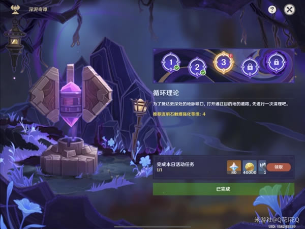《原神》是由上海米哈游网络科技股份有限公司制作发行的一款开放世界冒险游戏,于2017年1月底立项,原初测试于2019年6月21日开启,再临测试于2020年3月19日开启,启程测试于2020年6月11日开启,PC版技术性开放测试于9月15日开启,公测于2020年9月28日开启。 原神中深泥奇谭第三天的活动已经开启,部分玩家可能还不清楚,下面一起来看看原神循环理论通关攻略吧。 原神循环理论通关攻略 第一步:调整时间到次日!
