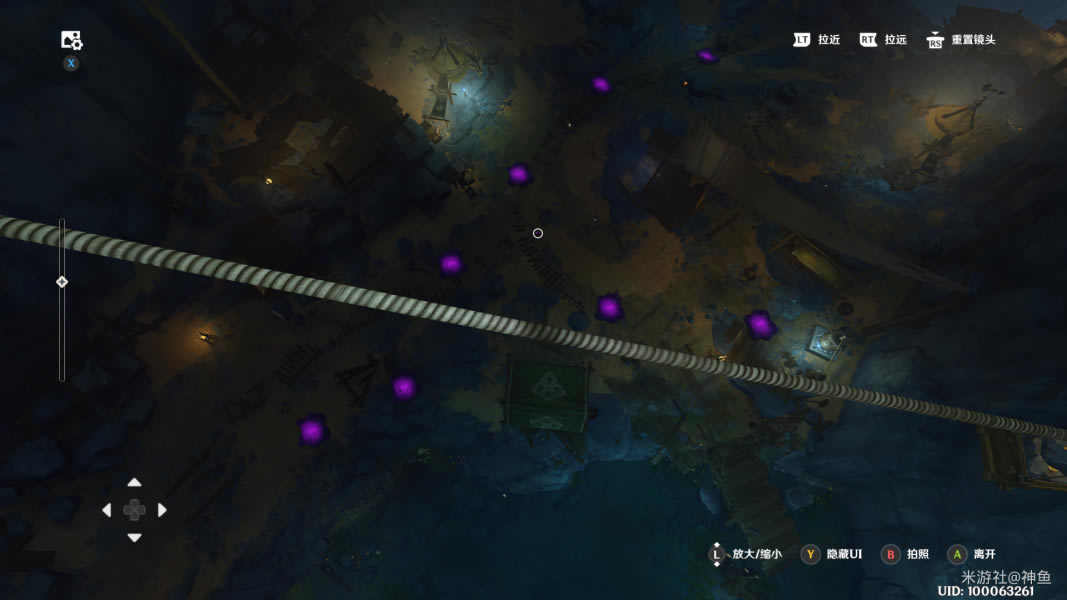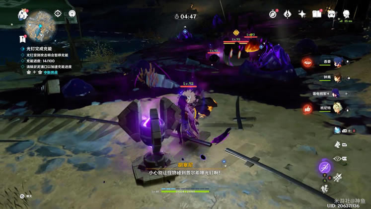 紫色的区域是淤泥涌口 up用白色圆圈标记的地方是光钉所在处(很小) 光钉在被攻击后的5s内将会停止充能 记得带上岩和火元素的角色 因为有大型岩史莱姆、岩盾丘丘人和木盾丘丘人