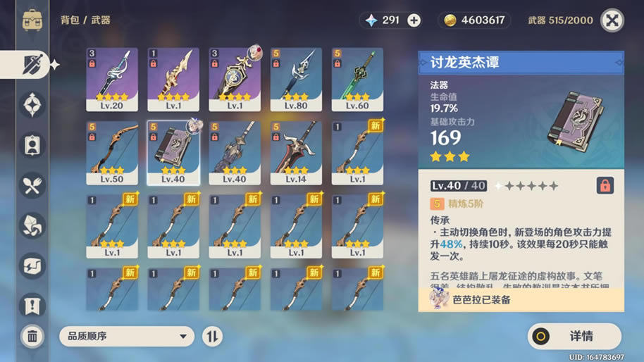 讨龙英杰潭:六命氪佬也不会放弃的顶级武器。芭芭拉的毕业武器,辅助流的凝光、莫娜、砂糖与丽莎也可携带。