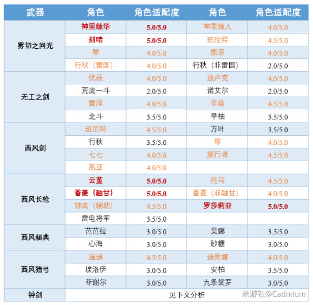 《原神》是由上海米哈游网络科技股份有限公司制作发行的一款开放世界冒险游戏,于2017年1月底立项,原初测试于2019年6月21日开启,再临测试于2020年3月19日开启,启程测试于2020年6月11日开启,PC版技术性开放测试于9月15日开启,公测于2020年9月28日开启。 原神2.6版本的武器卡池将up雾切之回光、无工之剑这两把武器,那么这两把武器适合哪些角色呢?下面一起来看看原神2.6雾切之回光、无工之剑适配角色一览吧。 原神2.6雾切之回光、无工之剑适配角色一览 具体分析之前,先放一个包含武器与对应各角色适配度的一图流汇总(如果没有列出来,说明不太适配或不太常见),后面会有详细的解释。
