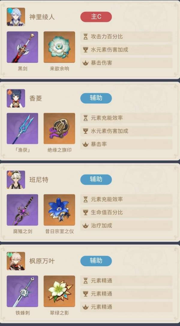 云堇二命就可以用了。这里辅助程度推荐六命云堇>零命万叶>六命班尼特。所以如果打算练神里绫人还是比较推荐练云堇的,伤害提升很明显。万叶替代角色比较多目前砂糖、琴、温迪都比较可以。如果要替换班尼特,需要选择护盾位置或强力奶位。 双火蒸发流 双火作为强力buff可以提高全队输出,队伍可以打蒸发反应。班尼特锁面板可以配合香菱、万叶、神里绫人元素爆发。队伍中神里绫人或香菱触发反应都可以接受。万叶负责增伤减抗。队伍中香菱有着不俗的输出,可以降低神里绫人的输出压力。