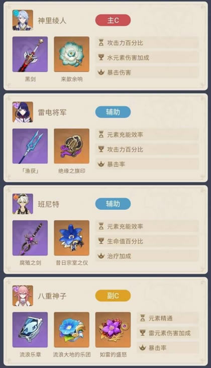 香菱元素爆发需要80较高的能量,且自身产球差。锅巴可以给球,但是需要战场。香菱作为后台副C不会用过多时间战场,队伍在注意伤害同时,需要处理香菱的充能问题。可以香菱带充能武器、班尼特打球、绝缘四件套来处理充能问题。队伍伤害比较充足,需要注意循环。 绫人感电队 神里绫人如果能保证元素爆发的循环,拥有非常优秀的挂水能力。队伍里选择雷神可以保证神里绫人元素爆发的循环和队伍的循环。班尼特虽然是火系角色,但队伍水雷反应比较频繁。班尼特增伤和强力治疗可以提高队伍伤害量。八重神子后台挂雷能力比较优秀,雷神也拥有较强挂雷能力。拥有元素爆发神里绫人战场挂水能力优秀,队伍并不依赖风属性角色。神里绫人元素战技进入冷却期,可以雷神元素爆发战场和八重神子元素爆发打一轮不错雷系爆发。一开始我以为感电队伍伤害可能不够,但是多次实战发现我这个配队对单伤害也相当不错。