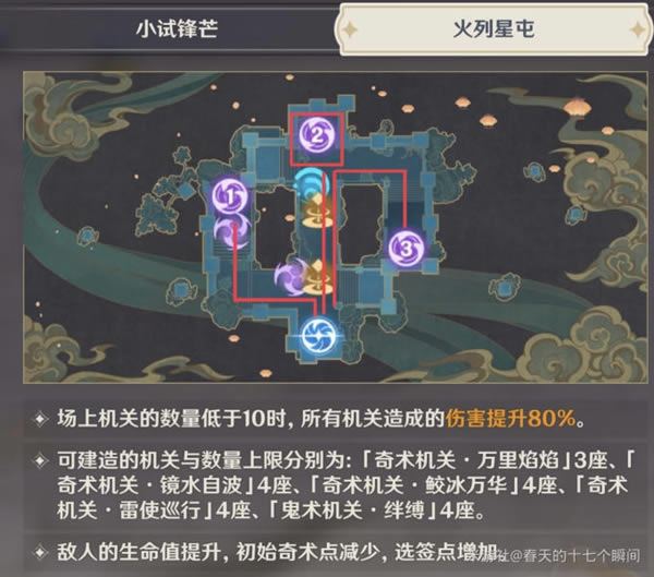 《原神》是由上海米哈游网络科技股份有限公司制作发行的一款开放世界冒险游戏,于2017年1月底立项,原初测试于2019年6月21日开启,再临测试于2020年3月19日开启,启程测试于2020年6月11日开启,PC版技术性开放测试于9月15日开启,公测于2020年9月28日开启。 原神春几回火列星屯如何高分通关?部分玩家可能还不太清楚,下面一起来看看原神春几回火列星屯3000分通关教程吧。 原神春几回火列星屯3000分通关教程 这里给大家带来的是机关棋谭“春几回”火列星屯3000分通关的教程。