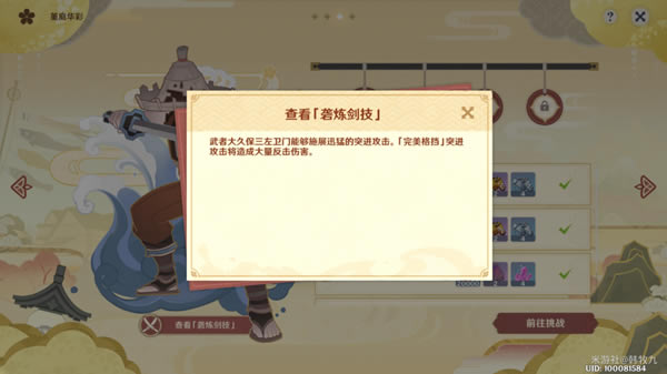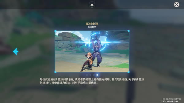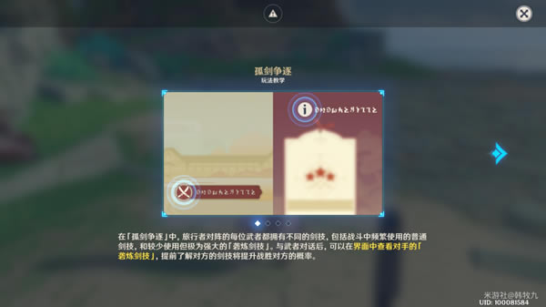 ▲玩法介绍1 ?在「孤剑争逐」中,旅行者对阵的每位武者都拥有不同的剑技,包括战斗中频繁使用的普通剑技,和较少使用但极为强大的「砻炼剑技」。与武者对话后,可以在界面中查看对手的「砻炼剑技」。