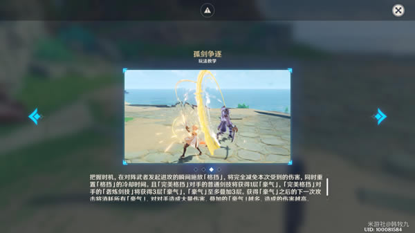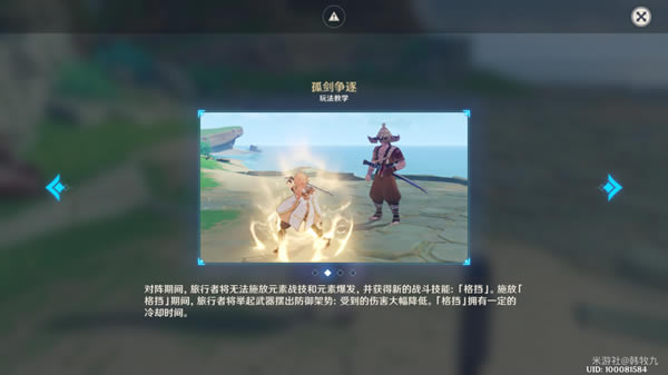 ▲玩法介绍2-2 ?对阵期间,旅行者将无法施放元素战技和元素爆发,并获得新的战斗技能「格挡」(代替元素战技)。施放「格挡」期间,旅行者将举起武器摆出防御架势:受到的伤害大幅降低。