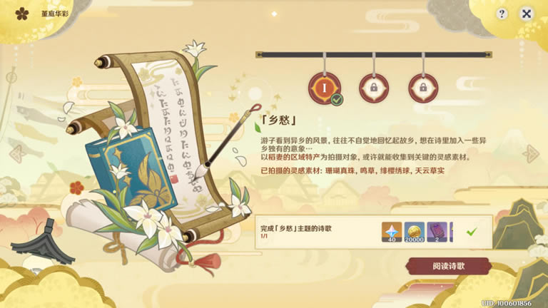 第一天-「乡愁」 游子看到异乡的风景,往往不自觉地回忆起故乡,想在诗里加入一些异乡独有的意象… 以稻妻的区域特产为拍摄对象,或许就能收集到关键的灵感素材。 稻妻的区域特产