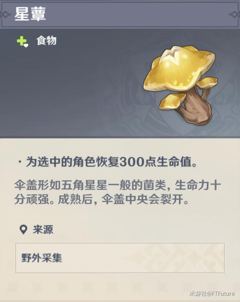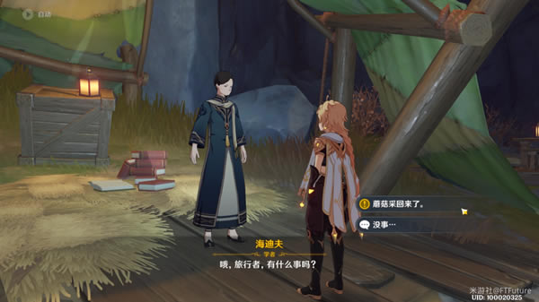 ▲星蕈 这种蘑菇会在拾取时为我们恢复1个流明石触媒的能量,同时作为食物存储在背包中,使用时可以恢复300点生命值。 任务触发条件:只要背包中有「星蕈」,就可以回到营地找海迪夫对话触发任务。没有「星蕈」的旅行者,可以在观测枢大地图中查找其点位进行摘取。 ▌1 和海迪夫对话 在背包中有「星蕈」时,我们到营地找学者海迪夫对话,选择选项「关于这种蘑菇…」