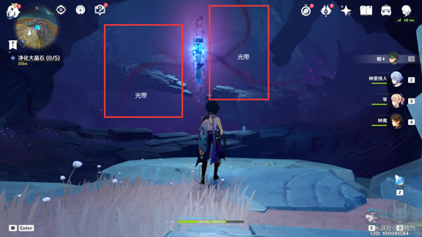 ▲「流明石原矿」 抵达点位后,自动触发剧情对话。 对话结束后,会提示获得成就「巨渊险过百牢关」。 ?3 净化大晶石 旅行者需要净化目标区域的5处大晶石。 ※旅行者可以通过链接“寒天之钉2号”(好像也没有名字,就这么叫了吧)上的5条黑色光带,来确认5处大晶石的位置。