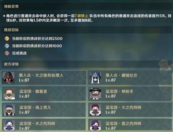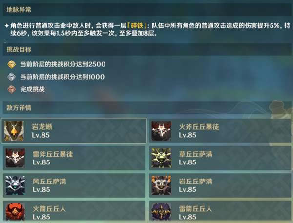 申鹤重云为试用,香菱叠精通和充能即可,班尼特只需充能,班尼特e后且香菱吃球,班尼特qe申鹤eq香菱eq重云qe循环,岩丘丘萨满会在小怪的倒数第二波刷新,优先击杀,在刷新萨满的时候就可以攒一波能量,集中输出丘丘暴徒和岩龙蜥即可