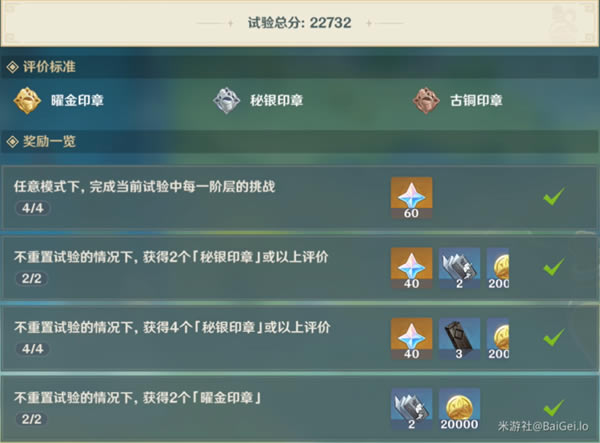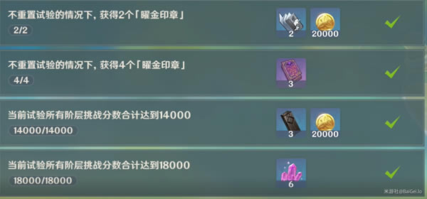 故按照上述条件,随着关卡挑战完成,剩余关卡难度上升的机制,各位旅行者只需要准备2只强力队伍进行交替使用,强力的魔药需要留到靠后的关卡,前面的关卡保留较为强力的魔药。 攻略建议 难度选择-【强对照组-积分倍率x2.5】 各阶层挑战顺序各位旅行者自行斟酌,我选择倒着来(4、3、2、1) 4分钟以内积分可达到6000+ <第四阶层·峰值研究>队伍+魔药配置参考